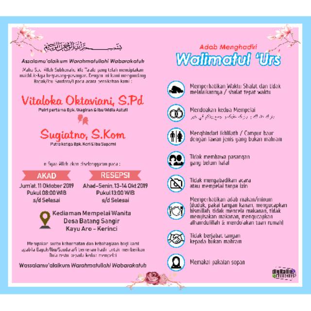 By mesynanjukolodi at 10:18 am. Undangan online yang memanfaatkan teknologi website yang dapat diakses dimana saja tanpa batasan jarak serta shared unlimited hanya menggunakan sebuah link website. Contoh undangan akad nikah dan pesta pernikahan (walimah) via wa. Bagi yang butuh format teks undangan nikah sms bb whatsapp. Informasi undangan yang kami bagikan semoga menjadi informasi terbaik dan bisa benrmanfaat.
